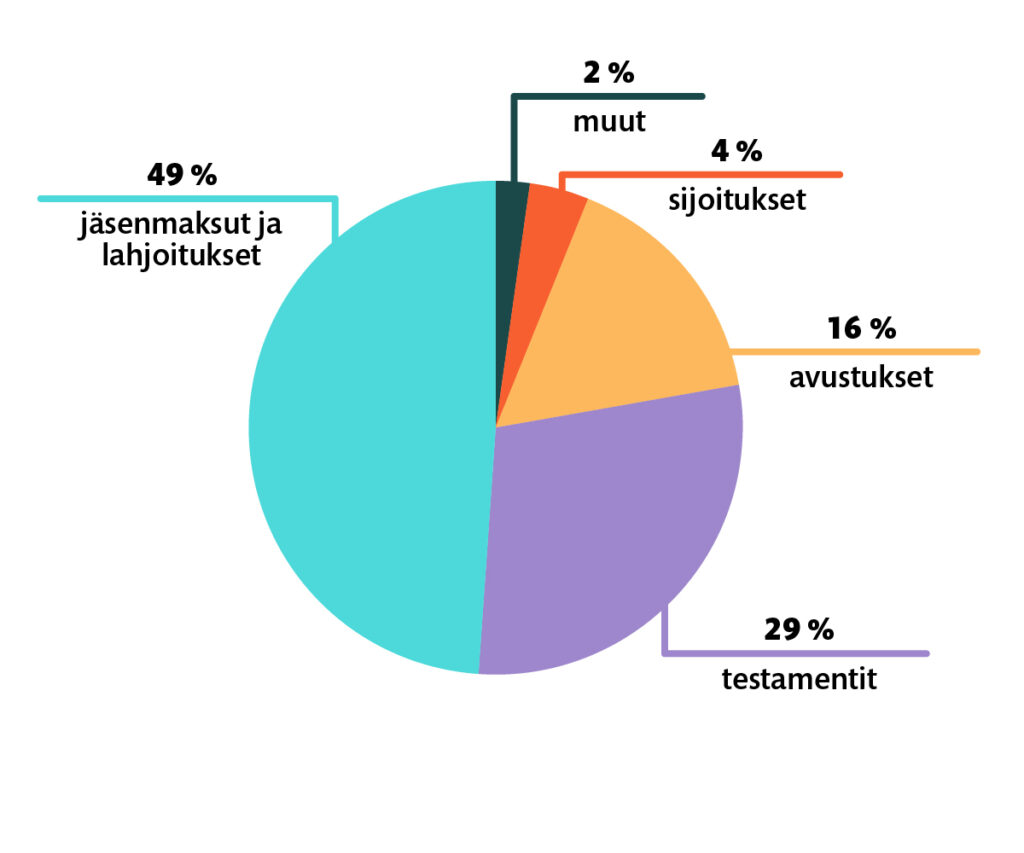 - Lähes 80 % yksityishenkilöiden tekemät jäsenmaksut, kerta- ja kuukausilahjoitukset sekä testamenttilahjoitukset