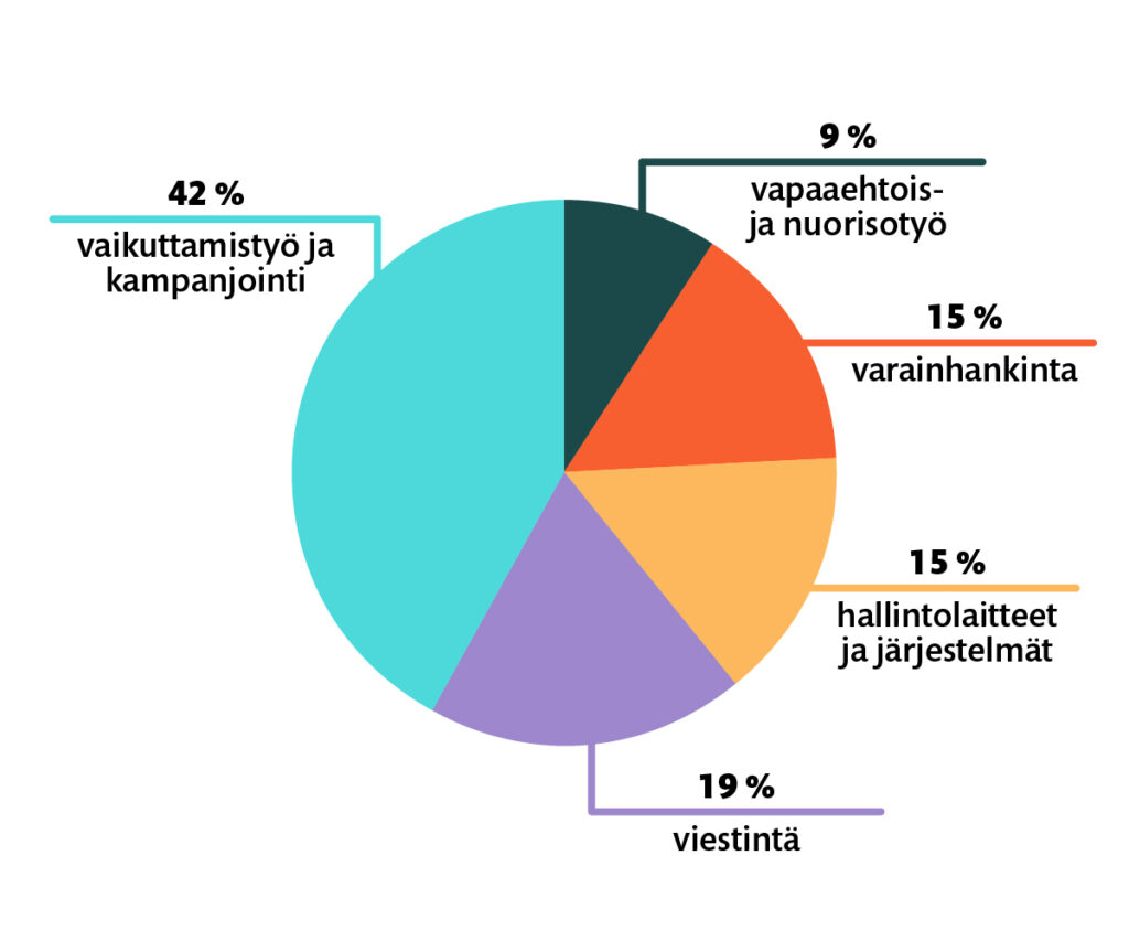 - 42 % poliittinen vaikuttamistyö ja kampanjointi eläinten suojelun ja oikeuksien parantamiseksi; vuoden pääpainopisteenä turkistarhauskiellon edistäminen
